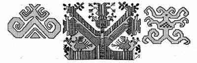 Мезень. Мезенский орнамент сохранил традиции, существовавшие еще в неолите. Здесь наличествует прямая связь с солнечной символикой, триада: треугольник, конь, красный цвет. Это знаки динамических процессов мира, знаки движения. Красный - "низкий" цвет, результат воздействия абсолютного источника света на землю. Красный - наиболее подходящий к цвету жизни, ее беспрерывному движению, развитию и воспроизведению, он - один из важнейших оберегов в ряду других цветов. В славянском орнаменте красный - главный цвет. |