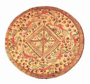 обл. Вариация темы "Пава". Золото (желтый цвет в орнаменте)- цвет солнечных лучей, в славянском орнаменте используется очень тактично, как у всех земледепьческих народов (желтый цвет не обладает статикой и не связан со стабильностью и ритмами земпедельческого календаря. Он обозначает движение (пусть и идущее из божественного источника) движение, имеющее вид потока искр. Касательность солнечных лучей, их стремительное внедрение в жизнь человеческую, их скорое исчезновение. |