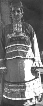 Майдан. Горьковская обл. Костюм, как известно, ориентирован в космическом пространстве. Весь он состоит из системы орнаментальных знаков, отвечающих тем или иным слоям мироздания. Орнамент сосредоточен на жизненноважных уровнях женского организма, влияющих на деторождение, состояние здоровья и общую гармонию семейных отношений. |